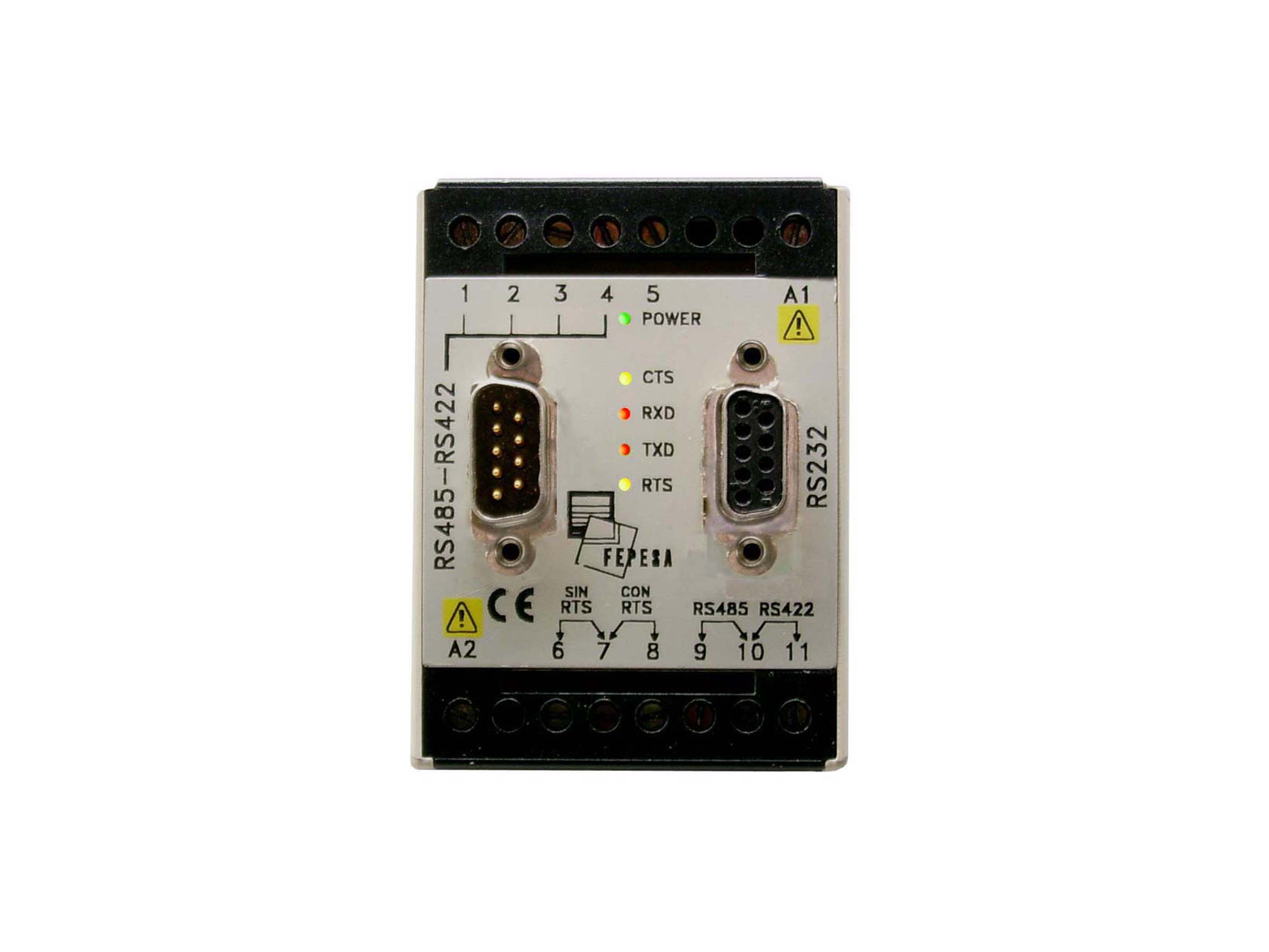 Equipo convertidor de señales de comunicación RS485 a RS232. Permite el envío de datos desde los conversores SE/Serie a un ordenador central situado a larga distancia.