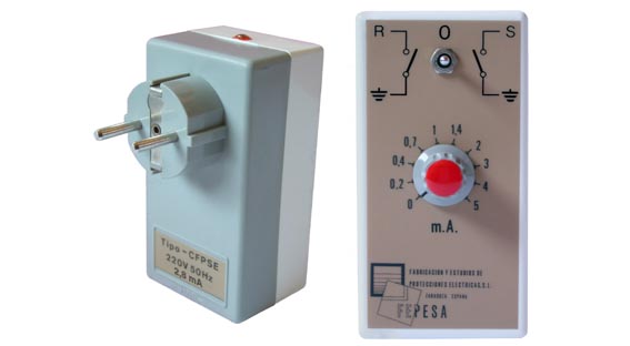 Caja enchufable Schuko para provocar fugas eléctricas a tierra, realizando los ensayos del funcionamiento correcto de los detectores de falta de aislamiento Tipo SE en quirófanos, Uvis, Rayos X y en toda instalación donde exista un transformador separador con su Detector de Falta de Aislamiento.
